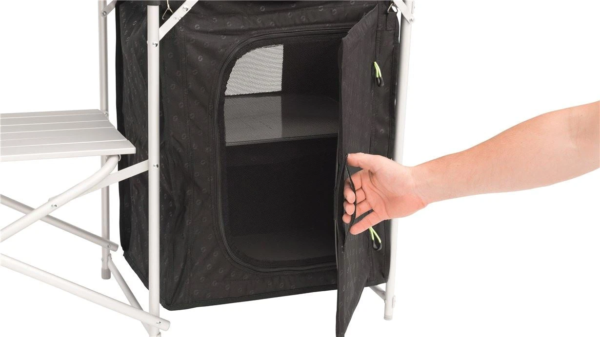 Create a safe kitchen area at your campsite with thanks to Outwellโs Camrose Kitchen Unit with table tops providing work space for preparing and serving food. The unit also includes a windshield allowing you to cook food with ease in windy conditions. The table storage space is made from durable embossed polyester fabric with zip closure that can be folded away neatly for access.