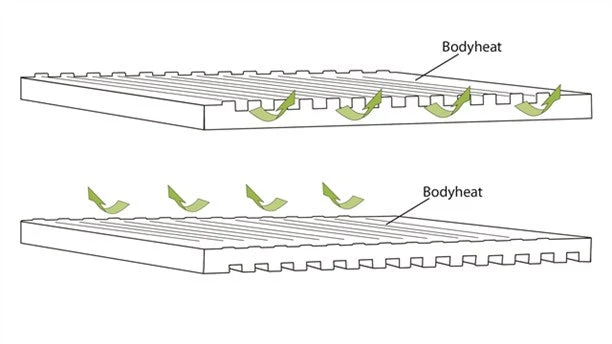 Ingenious heat regulation is achieved through o๏ฌset air core sculpting which enables greater or less body heat retention depending on which mat side is slept on โ a real performance boost when needed for optimum year round comfort. When the mat is turned with the air cores next to the body excessive heat can escape making it easier to cool down during warm summer nights. When the mat is turned the opposite way it gives the user the optimal insulation as the body heat is reflected by the foam. This option is used in colder nights. This air core design also o๏ฌers campers a softer sleep sensation as well as better ease of packing, lower weight and neater packed size.ย