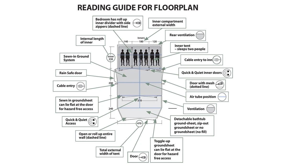 Sleeping six in three Premier Bedrooms with Dark Inners and Outwell Quick & Quiet Inner Doors, Norwood 6 offers versatile space in three zones, ideal for active campers seeking flexible tent living. The wide front of the light-filled design, with steep sides and front for maximum usable space, the Outwell HookTrack System, Rear Ventilation System, D-door and side door ensure practical camping comfort.