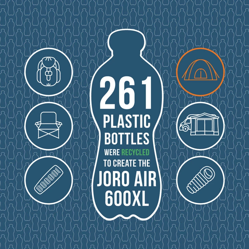 The Joro Air 600XL, 6-man inflatable AirBeamยฎ tent is the perfect family tent for those who love the outdoors. Part of our Earth Collection the Joro benefits from our Sentinel Eco Dura Fabric made from recycled single-use plastic and boasts a 4,000mmHH. New for 2023 includes an additional groundsheet protector, that will protect and extend the life of your groundsheet and tent. Combined with key features including the pre-attached front awning and large living area creates a spacious tent for all the family to relax in. Featuring our revolutionary AirBeam S.I Proยฎ Single Point Inflation System, designed to make pitching even easier. Tinted Diamond Pro windows and toggled curtains offer additional privacy and insulation while our Midnight Bedrooms keep the morning light at bay. A great choice for families or groups looking for a well-designed and versatile home from home on the campsite. The Joro Air 600XL is designed to provide the ideal camping experience in any weather. Tinted windows and curtains provide insulation and protection for more restful sleep, and the pre-attached awning ensures plenty of room for relaxing. With the AirBeam S.I Proยฎ Single Point Inflation System, setting up camp is easy and efficient. The eco-friendly Sentinel Eco Dura Fabric is made from recycled single-use plastic, so you can feel good about your choices. So with great protection, easy setup, and plenty of room, you’ll have a home away from home to enjoy your next camping trip.