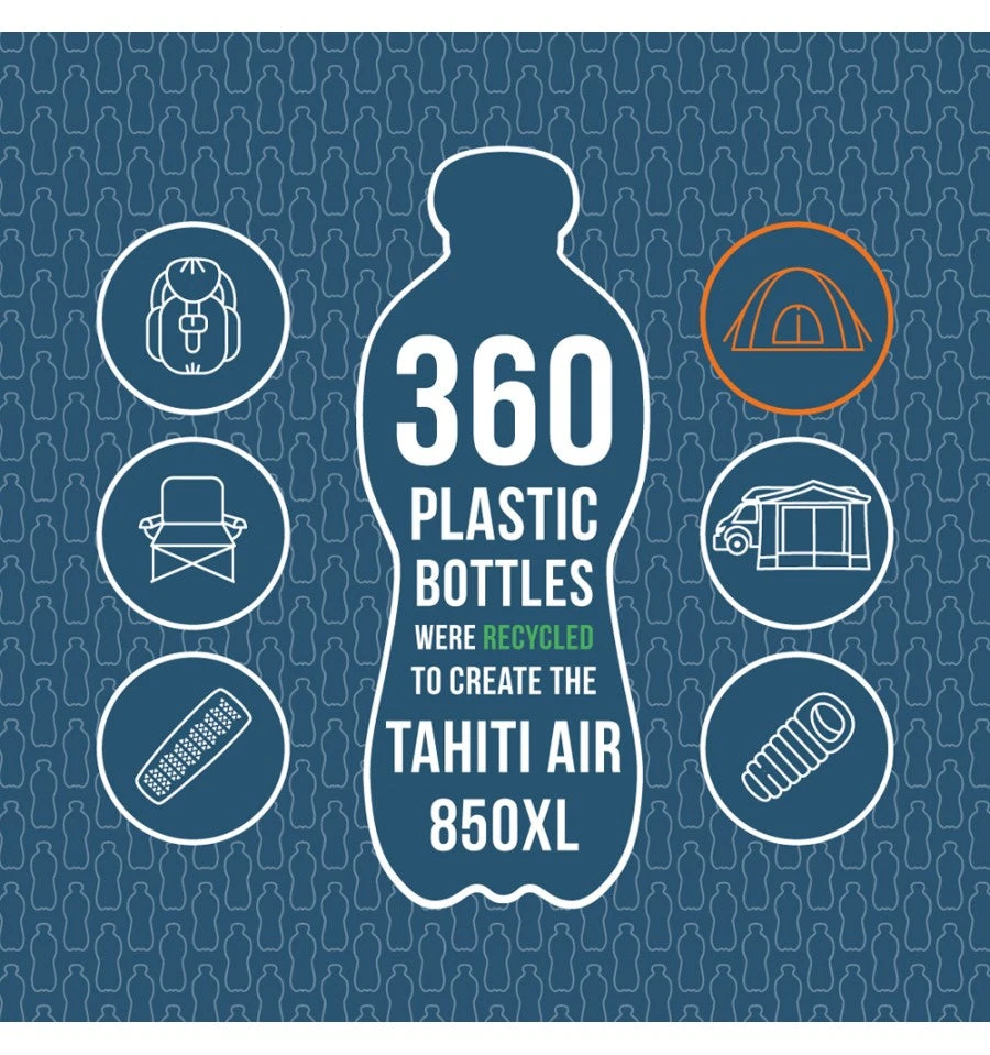 The Vango Tahiti 850XL Airbeam Tent is the perfect choice for larger families, providing spacious accommodation with a double living area, pre-attached front awning, and a side studio for extra storage. Constructed from the Earth Collection’s Sentinel Eco Fabric, made from recycled single-use plastic, it is rated at 3,000mmHH waterproof. Large Diamond Clear windows allow plenty of natural light into the tent, while roll-away toggled curtains keep it dark at night. With a Villa construction style, this tent offers maximum headroom at the sides, making it perfect for your next camping trip.